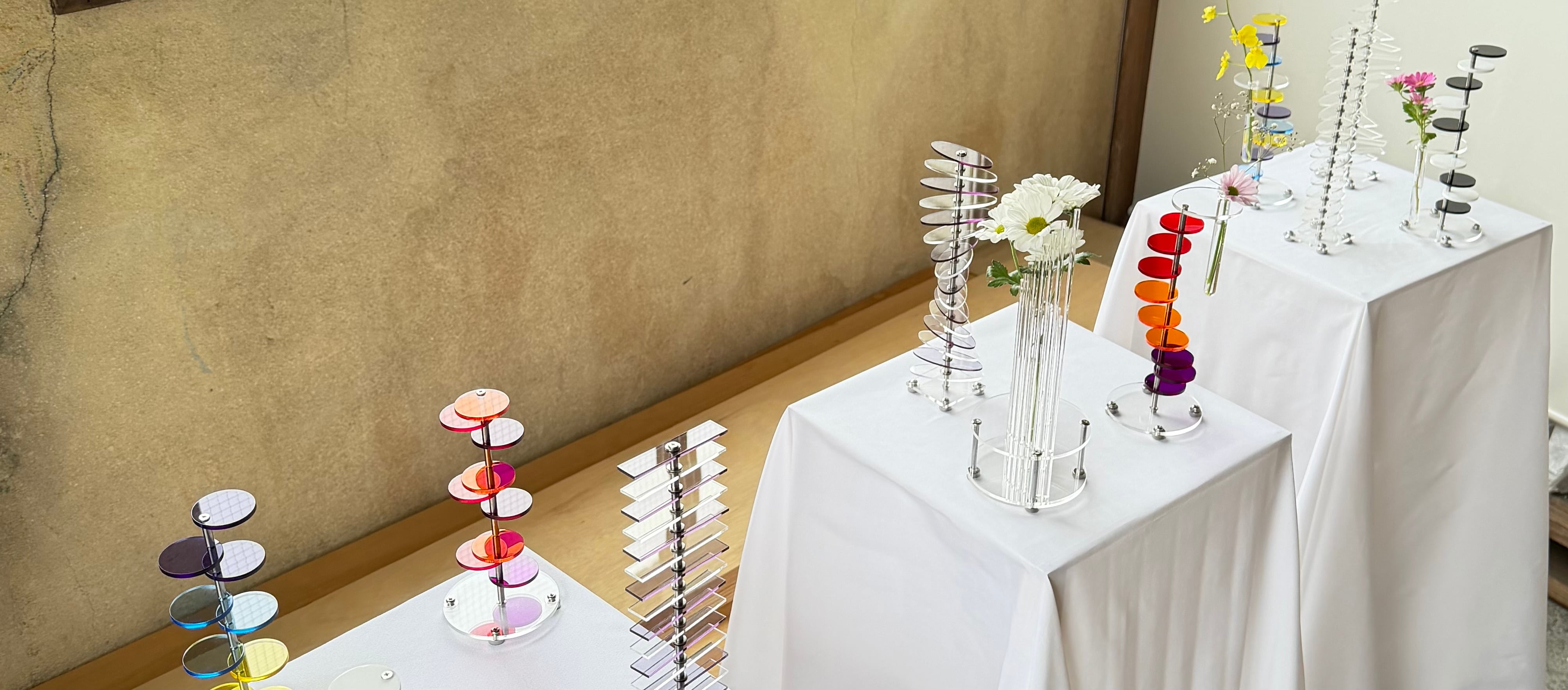 カラフルな円形パーツは自由に変更可能で、重ね方次第でグラデーションが生まれる。 花と一緒に色の重なりも楽しめるフラワーベース。 円形パーツ red×2 blue×2 yellow×2 orange×2 clear×5 サイズ : W 70 × D 70 × H 110mm 重さ : 95g 素材 : アクリル・ステンレス 付属品 : 試験管 13ml・150mm・φ15、プラスドライバー、システムクロス 日本製 汚れなどは柔らかい布で優しく水拭きをした後に乾拭きしてください。 ご購入の前にご確認ください。 ・色やサイズなど若干の個体差がございます。 ・小さなお子様の手の届かない場所でご使用ください。 ・あまり無理な力を加えないでください。 ・製造工程上、細かなキズ、焼け跡などある場合がございます。(初期不良には含まれません) ・製品の特性上キズがつきやすくなっておりますので取り扱いには十分ご注意ください。 ・アクリル同士を重ねた際に、干渉縞が起きる場合がございます。自然な現象ですので予めご了承ください。 ・ビスの締めすぎにはご注意ください。 ・試験管はガラス製のため、強い衝撃や無理な力を加えると破損する恐れがあるため、取り扱いには十分ご注意ください。