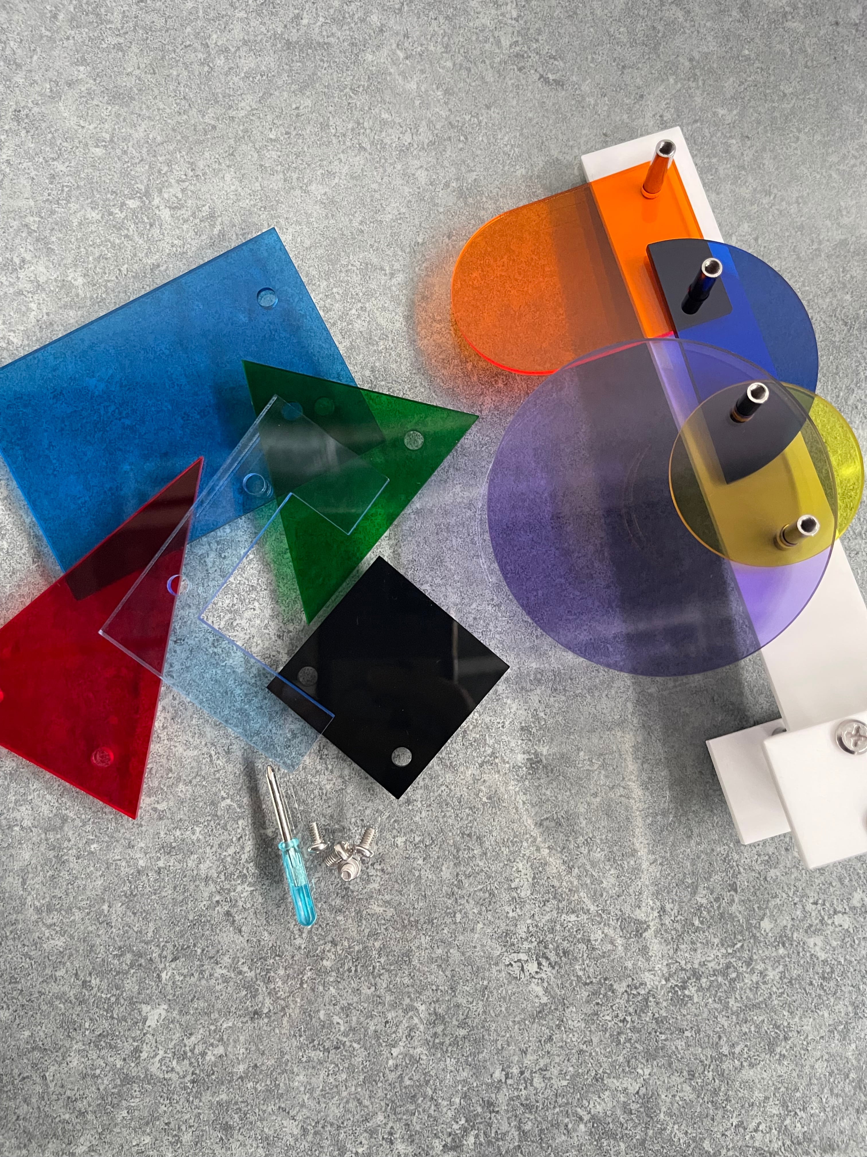 形はシンプルなのに、重なった瞬間に複雑な色や奥行きが生まれるオブジェ。